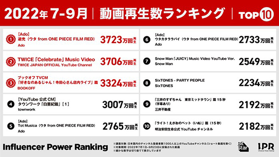また、「トップ10のうちMVが六つ、CM動画が四つランクインする結果となった。MVはONE PIECE REDに関係するAdoさんの3曲がランクインしており、複数のメディア・プラットフォームで相乗効果を生む企画力の強さがうかがえる」と総括している。