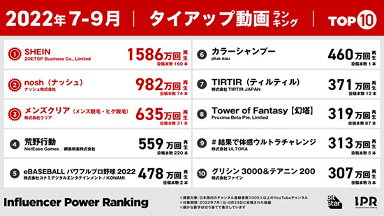 「タイアップ動画ランキング」は、7月1日~9月23日に投稿されたタイアップ動画(広告コンテンツ)で、同期間に多く再生されたランキング。大山氏は、「2022年上半期ランキングで2位だったSHEINが1位になった。動画の内容は購入品紹介が中心で、ライフスタイル系に加え、エンタメ系・美容系・カップル系と幅広いジャンルのクリエイターを起用し、約160本の動画を投稿。起用クリエイターの登録者数も数万人から100万人規模とさまざまで、ターゲットを拾い落とさないよう設計されていることが見受けられる」と解説している。