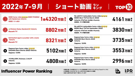 「チャンネル総再生数ランキング」は、7月1日~9月23日にYouTubeに投稿された動画で、同期間に多く再生されたチャンネルのランキング。インフルエンサー・アナリストの大山純平氏は、「2022年上半期ランキングで3位だった『Sagawa / さがわ』さんが見事1位となった。登録者数は1300万人を超え、約半年で300万人以上の伸びを見せた。縦型・短尺のショート動画では、海外コンテンツへのリアクション動画が1000万回超えを連発し、グローバルなファン層の厚さを見せつけた」と解説している。