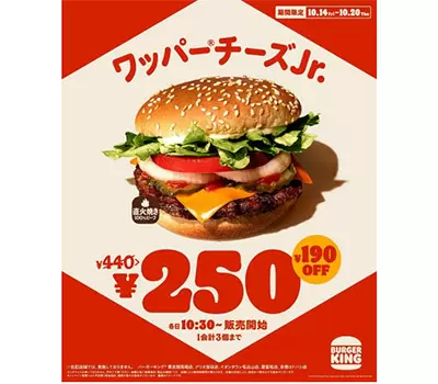 バーガーキングでは10月14~20日の1週間限定で「ワッパーチーズJr.」を特別価格250円で販売するキャンペーンを実施している。