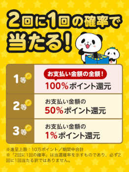 抽選で当たるポイントは、1等が決済金額の100%(全額還元)、2等が同50%、3等が同1%。キャンペーンによる進呈上限は期間中10万ポイント。なお、楽天ペイを導入していない店舗や、導入済み店舗であってもショッピングモール内の店舗など一部店舗は対象外となる。