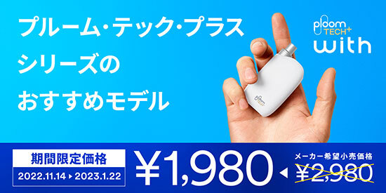日本たばこ産業(JT)は、CLUB JTオンラインショップ、全国のPloom Shop、全国のコンビニエンスストア、たばこ販売店などで、低温加熱型の加熱式たばこ用デバイス「プルーム・テック・プラス・ウィズ」を、通常価格2980円のところ、期間限定の特別価格1980円で販売するキャンペーンを11月14日に開始する。