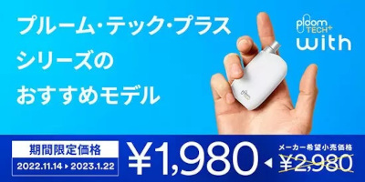 JTは、CLUB JTオンラインショップ、全国のPloom Shop、全国のコンビニエンスストア、たばこ販売店などで、低温加熱型の加熱式たばこ用デバイス「プルーム・テック・プラス・ウィズ」を通常価格2980円のところ、期間限定の特別価格1980円で販売するキャンペーンを11月14日に開始。期間は2023年1月22日までとなる。
