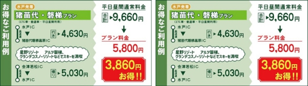 仙台発着プラン(いずれも仙台南、仙台宮城、仙台東他発着)の価格は、安比・八幡平プランが普通車6600円、軽自動車など5300円、夏油プランが普通車4500円、軽自動車など3600円、猪苗代・磐梯プランが普通車5100円、軽自動車など4100円。