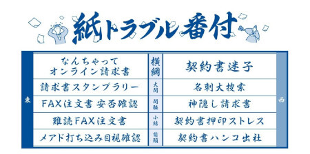「紙トラブル番付」は、請求書、契約書、注文書、名刺といった紙書類を扱う業務に携わる1000人のビジネスパーソンを対象とした調査をもとに、頻繁に発生している計10種類のトラブル事象を相撲の番付形式で東西の横綱、大関、関脇、小結、前頭にまとめたもの。