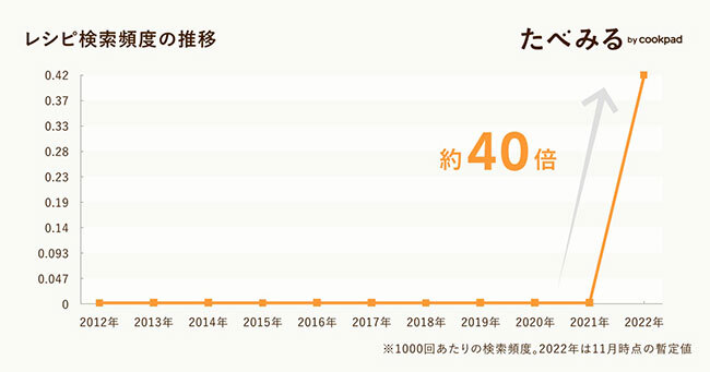 食トレンド大賞2022で大賞になった韓国風やみつき卵は、今年初旬にTikTokの動画で注目度が高まり、人気YouTuberのチャンネルで「作ってみた」動画が投稿されると同時に人気に火が付いたという。ネーミングのインパクトやおいしさ、安価な食材で手軽に作れることから人気が加速。そのため、レシピ検索頻度が1年で約40倍に増加した。