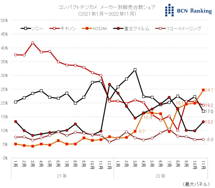 21年は5%前後で推移していたKODAKのシェアは、じわじわと増加していき、22年3月に9.7%まで上昇。4月は「PIXPRO FZ43」の販売台数が伸びたことに加え、ソニーの販売台数が急減した影響もあり、シェアが16.4%まで拡大した。7月は一旦後退したものの、8月は新製品「PIXPRO FZ55」の発売が奏功して18.1%まで伸長。11月には過去最高の24.7%を記録し、初めてメーカーシェアで首位を獲得した。