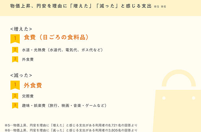 物価上昇・円安を理由に「増えた」と感じる支出項目は、1位が「食費(日々の食料品)」、2位が「水道・光熱費(水道代、電気代、ガス代など)」、3位が「外食費」だった。反対に、物価上昇・円安を理由に減った支出項目は「外食費」が1位となり、2位に「交際費」、3位に「趣味・娯楽費(旅行、映画・音楽・ゲームなど)」が続いた。
