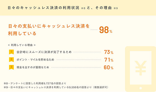 なお、資産管理アプリ・サービス「マネーフォワード ME」利用者に対する調査のため、日々の支払いに電子マネーやクレジットカードなどのキャッシュレス決済サービスを利用している割合は、98%とほぼ100%近くに達した。その理由の上位は「会計時にスムーズに決済が完了するため」「ポイント・マイルを貯めるため」「現金を出すのが面倒なため」(複数回答可)で、いずれも6割を超えた。