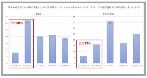 ビザ・ワールドワイド・ジャパンが18歳以上の男女1001人を対象に実施した、「日本の消費者の移動や通勤におけるタッチ決済対応の国際ブランドクレジットカードやデビットカード使用に関する意識調査」によると、20代(120人)は交通系プリペイドカードのチャージを「不便」と感じる割合が他の年代を大きく上回り、「不便である」との回答が40%にのぼった。