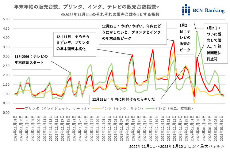 さすがに元日からプリンタを買いに行く気は起きない、ということもあるだろう。しかし、2日になると売り上げがググっと上昇。元日にもらった年賀状に返信しなきゃ、という別のプレッシャーによる焦りから、プリンタの売り上げが一気に息を吹き返す。しかし、インクの売り上げは年が明けると伸びない。年賀状を出すのか出さないのか。プリンタは壊れている。年明けまで結論を引っ張れるだけ引っ張った挙句、最後の最後に決断を迫られ、ついに観念して新しいプリンタを購入し、返事も含めて年賀状問題に終止符を打った、という葛藤の軌跡だ。ちなみに、テレビの売れ行きは、11月の末ごろから立ち上がり、12月に入って一定の売り上げを維持、1月2日の初売りでピークを形成というパターンだった。