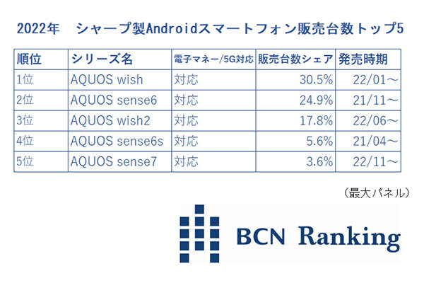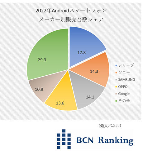 BCNランキングによると、22年のAndroidスマホの販売台数は前年比77.5%と伸び悩んだ。性能向上と為替変動による価格高騰に加え、21年10月1日以降に発売する端末に対する「SIMロック原則禁止」など、端末販売に関する総務省のガイドラインの影響が少なからずあったようだ。22年上位5社のシェアは、1位のシャープが17.8%、2位のソニーが14.3%、3位のSamsungが14.1%、4位のOPPOが13.6%、5位のGoogle10.9%で、2位~5位は前年とは順位が入れ替わった。