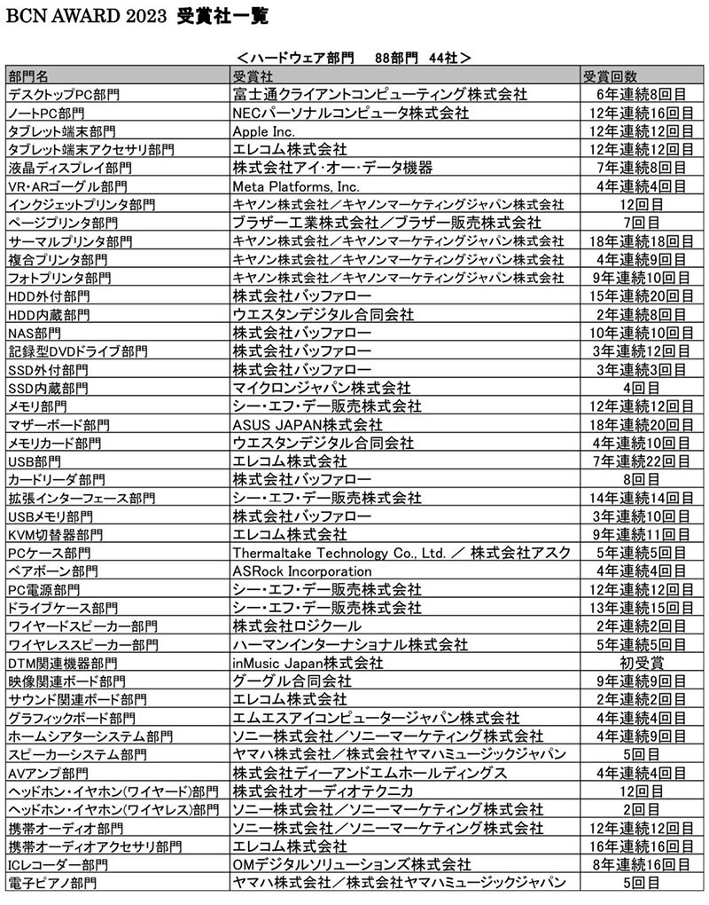 「BCN AWARD」は、家電量販店などから集計している実売データ(POSデータ)をもとに、部門(ジャンル)ごとに年間販売数量累計1位の企業を表彰する制度。24回目となる「BCN AWARD 2023」の対象期間は2022年(1月1日~12月31日)で、ハードウェア88部門44社、ソフトウェア24部門14社、合計112部門で58社が受賞した。