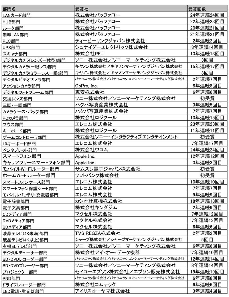 このほか、PFUがスキャナ部門で13年連続、ノートPC部門でNEC、タブレット端末部門とスマートフォン部門でApple、携帯オーディオ部門でソニー、BD・DVDレコーダー部門でパナソニックがいずれも12年連続で、複合プリンタ部門でキヤノン、メモリカード部門でウエスタンデジタルがいずれも4年連続で受賞している。