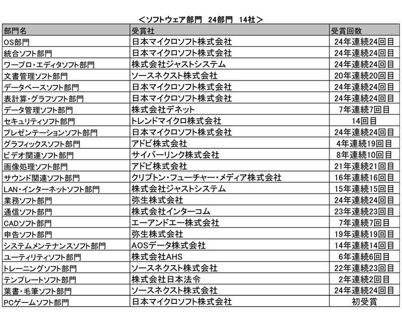 バッファロー(LANカード部門)/ワコム(ペンタブレット部門)/日本マイクロソフト(OS部門、統合ソフト部門、データベースソフト部門、表計算・グラフソフト部門、プレゼンテーションソフト部門)/ジャストシステム(ワープロ・エディタソフト部門)/弥生(業務ソフト部門)/ソースネクスト(葉書・毛筆ソフト部門)