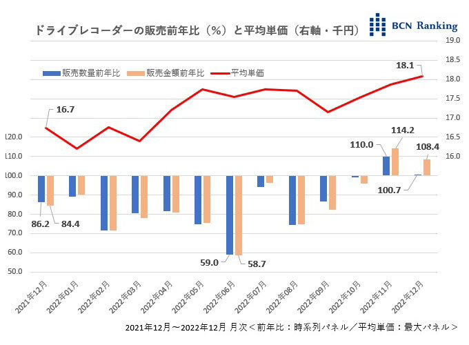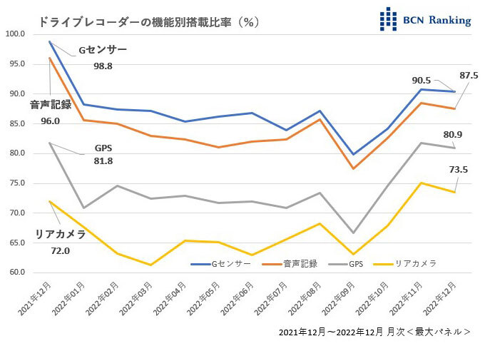 21年12月、ドライブレコーダーの販売前年比は台数で86.2%、金額でも84.4%と2桁割れ。以降、22年6月に台数59.0%、金額58.7%まで落ち込んだのをピークに、10月までは前年割れが続いていた。しかし、年末商戦を控えた11月から12月、久々に前年を上回った。平均単価(税抜き、以下同)も上昇。21年12月の1万6700円から22年12月には1万8100円と8%値上がりした。一方で、主要機能の搭載率を見ると、例えばリアカメラでは21年12月は72.0%だったのに対し、22年12月は73.5%とわずかに搭載率が上がっただけ。逆にGセンサーや、音声記録機能、GPSなどの各種搭載率はこの1年で低下している。全体が値上がりしている状況ではあるものの、コロナ禍から脱しつつある環境が販売を押しあげているようだ。
