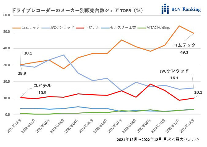 メーカー別の動きを見ると、この1年で大きくシェアを拡大させたのがコムテック。21年12月の30.1%から22年12月には49.1%と躍進した。逆にJVCケンウッドは29.9%から16.1%へと大幅にシェアを失った。シェア差が開いた大きな要因はJVCケンウッドが4月に実施した値上げだ。例えば、主力製品の「DRV-MR450」の平均単価は3月では1万3000円だったが、4月には2.9%上昇、6月には1万6600円と27.7%も上昇した。メーカー全体の平均単価でも、コムテックはおおむね21年3月の水準を下回って推移している。一方で、JVCケンウッドは、7月には3月比で28.6%も上昇。落ち着いてきた12月でも8.7%高いままだ。