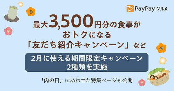 ヤフーは、飲食店予約サービス「PayPayグルメ」で最大3500円分のポイントが付与され、そのポイントを食事する際に使用できる「友だち紹介キャンペーン」など、2月に使える期間限定キャンペーン2種類を実施している。
