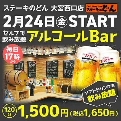 アークミールは、同社の運営する「ステーキのどん大宮西口店」(埼玉県さいたま市)に導入したセルフ式の「アルコールバー」による、税別1500円で2時間飲み放題プランの販売を2月24日に開始した。