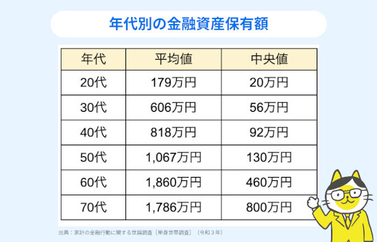 金融広報中央委員会が発表している「家計の金融行動に関する世論調査[単身世帯調査](令和3年)」データによれば、年代別の金融資産保有額(株や生命保険などの金融資産を保有していない世帯を含む)は、単身世帯の30歳代で平均値が606万円、中央値が56万円、40歳代で平均値が818万円、中央値が92万円、50歳代で1067万円、中央値が130万円となっている。