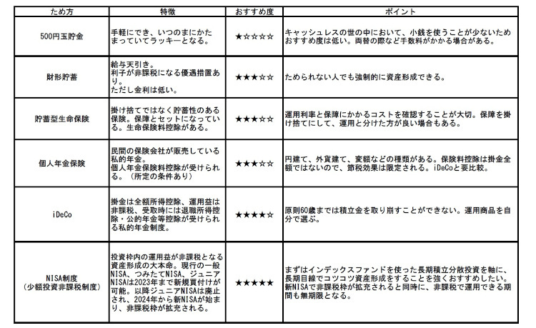 最後にためる方法とおすすめ度、ポイントを紹介する。人生100年時代、インフレ対策も重要な世の中になっている。これからコツコツためる力を養って、時間をかけて資産形成をしていこう。