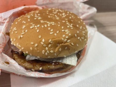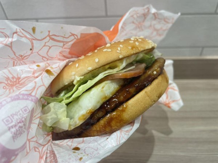 包み紙を開けると、ボリューム感のあるハンバーガーが登場。バンズの下に見えるタルタルソースとハンバーガーからはみ出る大きなベーコンが特徴的だ。てりたまならではのぷるんとしたたまご、ツヤツヤとしたてりやきソース、鮮やかなレタスも相まって迫力感のある見た目に。ほんのりとレモンの香りも感じられ、一気に食欲がそそられる。