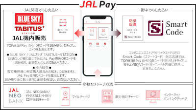 3月22日から利用できるのは、JALUXが運営する全国の空港店舗「BLUE SKY」「JALプラザTABITUS+STATION」、コンビニエンスストアやドラックストア、スーパーマーケットなどの「Smart Code(スマートコード)」対応店舗。3月30日から、JAL機内販売で利用できるようになる。