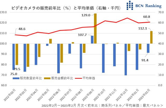 ビデオカメラの販売が徐々に回復し始めている。この2月、販売金額前年比が112.1%と2桁上昇を記録。販売台数こそ依然91.4%と前年割れだが、マイナス幅を徐々に縮めており、前年並みの水準が見えてきた。販売金額が一足先に回復しているのは単価上昇が一因だ。平均単価(税抜き、以下同)は昨年2月の4万8600円からこの2月には6万800円と25.0%上昇。ソニーが実施した度重なる値上げも影響している。