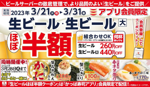 かっぱ寿司は、3月21日(本日)から31日までの期間、かっぱ寿司で利用できる「生ビールほぼ半額クーポン」をかっぱ寿司アプリ会員に配信する。1組につき、1000円以上の会計で利用できる。