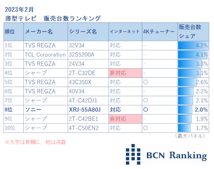 2023年2月、薄型テレビは32型が1位・2位に 新生活シーズンは中小型が売れる
