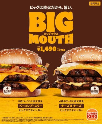 バーガーキングから3月31日から期間限定で、直火焼きの100%ビーフパティを使用した「ベーコンブースター ビッグマウスバーガー」「チーズ&チーズ ビッグマウスバーガー」が発売となる。価格は、どちらも単品で1490円、セットで1790円。