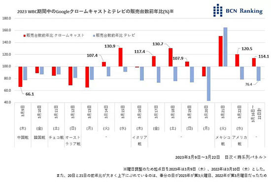 テレビは、期間中の販売台数前年比が78.0%に終わった(曜日を合わせるため今年3月9日木曜日~3月22日水曜日と昨年3月10日木曜日~3月23日水曜日の販売台数で比較)。売り上げが急増したのは、テレビにつなぐとネット動画を楽しめる「Googleクロームキャスト」。準々決勝ラウンドに突入した16日のイタリア戦以降、前年比で114.1%と2桁増を記録した。(BCN・道越一郎)