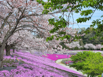 明和興産の運営する「東京ドイツ村」(千葉県袖ヶ浦市)では、芝桜が3月下旬から見頃を迎えている。