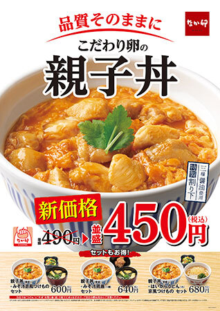「なか卯」は4月6日(本日)11時、看板商品「親子丼」の価格を改定し、並盛450円で提供を開始した。