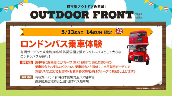 イベントでは、“テントサウナ体験付きリゾートホテルの宿泊券”や“TARPtoTARPの新作タープ”が、合計20人に当たるプレゼントキャンペーンを実施する。また、期間中は、ロンドンバスが、会場となる「有明ガーデン」と「東京臨海広域防災公園」を巡回し、会場間の移動を楽しく、スムーズにする。