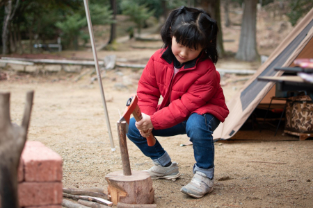 「親子で薪割り・焚き火体験」(無料・各日先着100人(整理券配布))では、親子で薪割りや火の扱い方を実践的に学ぶことができる。