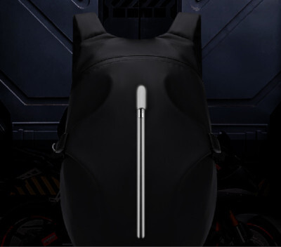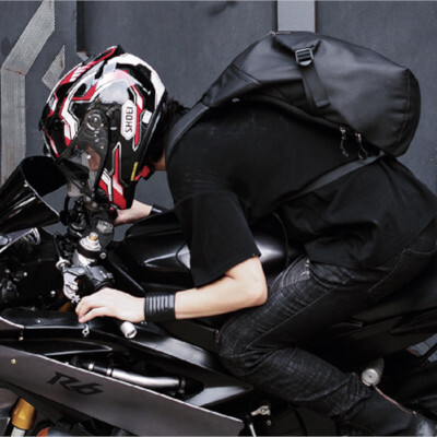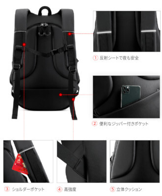 表面のジッパーとショルダーストラップにはリフレクターが付いており、自動車などのライトを反射することで夜道での事故・衝突を防ぐ。また、ショルダーベルトを胸の前でロックして、バイクに乗っているときでも揺れないように固定できる。