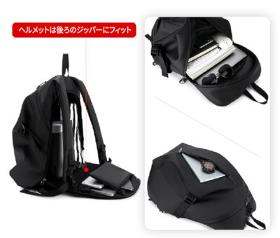 バッグの中にはパソコンやiPadが収納できる2層式のポケットがある。ヘルメットバッグの右側には、鍵、イヤホン、水筒などのアイテムを収納できる。背面には取り出しやすいジッパーポケットがあり、財布やスマートフォンなどを収納できる。