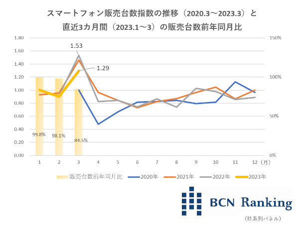 3月の販売台数は前年同月比84.5%。これは過去3年間で最も低い水準だ。とはいえ、21年1月~23年3月の月間販売台数を比較すると、22年3月、21年3月に続き、3番目に多かった。また、新型コロナウイルスの感染拡大のため、キャリアショップや家電量販店の休業・時短営業があった20年3月は上回っている。