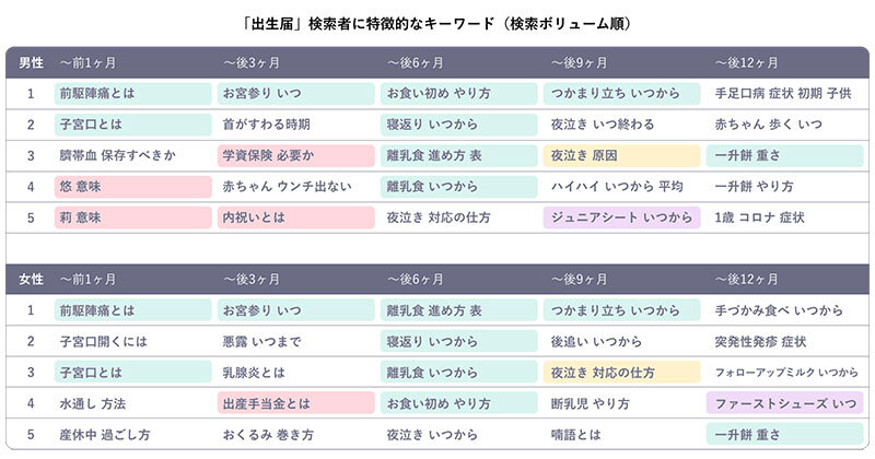 調査の結果、上位は男性、女性ともに似た悩みを検索していることがわかった。また、異なるキーワードでも「いつから」「いつまで」といった期間に関する検索が多く見られ、成長にともなう変化がいつ頃起きるのかや、「お食い初め」などのイベントの実施時期を調べている様子がうかがえる。一方で、男性のみ上位に出てきていたキーワードからは、名前を出産前に熱心に考えていること、学資保険や内祝いなど出産育児の周辺情報について調べていることがわかった。