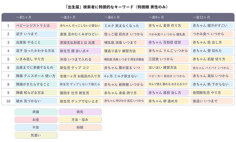 次に、検索者を男性に絞って特徴度をランキングにした。出産前は、「逆子 いつまで」「破水 気づかない」など不安を抱えながら準備をしている様子が見て取れた。また、「陣痛 和らげる方法」など配偶者を気遣っていることがわかった。