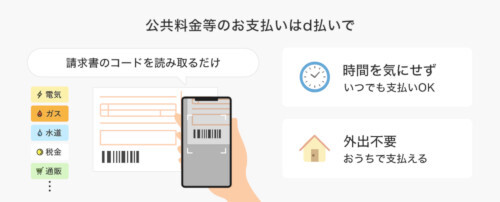 d払いの請求書払いは、電気やガス料金といった公共料金や、税金、通販などの請求書に記載されているバーコードなどを「d払い」アプリで読み取って、24時間いつでもその場で支払える機能。4月17日からは、地方税の納付書に印字された地方税統一コード「eL-QR(エル キューアール)」に対応し、約1700の地方自治体における自動車税や固定資産税など地方税の納付が可能になった。なお、d払いの請求書払いでの支払い手段は、「d払い残高」のみとなる。
