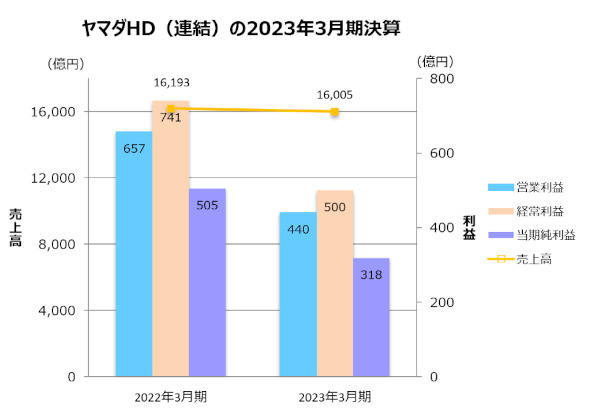 ヤマダホールディングス(ヤマダHD)が5月8日に発表した2023年3月期通期の連結決算は、売上高が1兆6005億円(前期比1.2%減)、営業利益が440億円(同32.9%減)、経常利益が500億(同32.5%減)、親会社株主に帰属する当期純利益が318億円(同37.0%減)の減収減益となった。減収減益は2期連続。