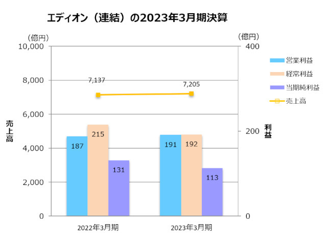 エディオンは5月9日に2023年3月期通期の連結決算を発表した。売上高は7205億円(前期比1.0%増)、営業利益は191億円(同2.1%増)、経常利益は192億円(同10.8%減)、親会社株主に帰属する当期純利益は113億93百万円(同13.1%減)だった。