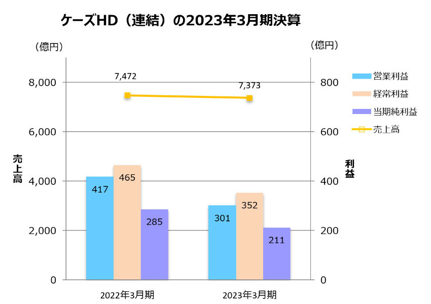 ケーズホールディングス(ケーズHD)は5月10日、2023年3月期通期の連結決算を発表した。売上高は7373億円(前期比1.3%減)、営業利益は301億円(同27.8%減)、経常利益は352億円(同24.2%減)、親会社株主に帰属する当期純利益は211億円(同26.0%減)の減収減益だった。