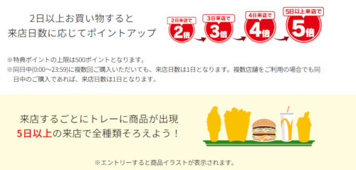具体的には、キャンペーン期間中に2日来店で期間中にマクドナルドで獲得した楽天ポイントが2倍(通常ポイント1倍+特典ポイント1倍)、3日来店で3倍(通常ポイント1倍+特典ポイント2倍)、4日来店で4倍(通常ポイント1倍+特典ポイント3倍)、5日以上来店で5倍(通常ポイント1倍+特典ポイント4倍)となる。「1ハッピー」特典の進呈上限は500ポイント。