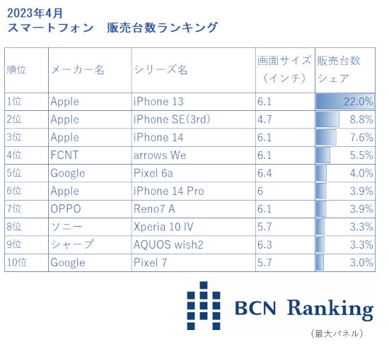 Androidに限ると、FCNTの「arrows We」がトップ(スマホ全体では4位)。前月3位だったGoogleの「Pixel 6a」は5位にランクダウンしたが、Pixel 7 Pro/7の廉価版「Pixel 7a」が5月11日に発売になり、5月の直近週のランキングではAndroidスマホのトップに立っている。なお、FCNTは5月30日に民事再生法の適用を申請しており、事業再生に向けスポンサーが現れない場合は、2023年2月10日発売のエシカルスマホ「arrows N F-51C」がarrowsシリーズ最後の機種となる。