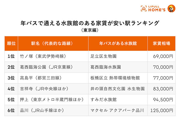 そこでLIFULL HOME'Sは、東京都内で年間パスポートを発行している主な水族館がある駅を調べ、賃貸物件の家賃相場が安い駅のランキングを作成した。