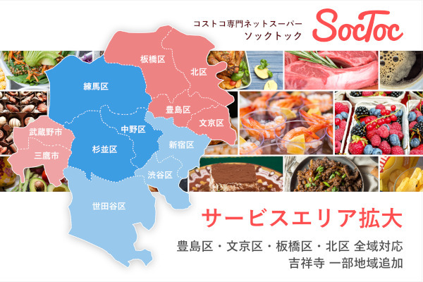 「SocToc」は、会員制倉庫型店コストコで人気のデリやベーカリー、精肉・鮮魚といった生鮮食品を購入することができる「コストコ専門ネットスーパー」サービス。スマホから注文することで時間帯指定でコストコの商品を自宅まで届ける。コストコ会員でなくても年会費0円で利用可能。「コストコの商品は量が多くて購入が難しい」というニーズに対応し、独自に小分け・詰め合わせの商品も提供する。今年2月末から杉並区・練馬区・中野区の一部地域のみでのβ版サービス提供を開始し、3月20日からさらに新宿区・渋谷区・世田谷区の一部地域へとエリアを拡大してきた。