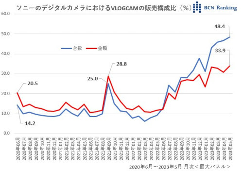 ソニーのVLOGCAMが好調だ。日常を動画で記録したりYouTubeなどで情報発信する人たち、いわゆるVlogger(ブイロガー)向けに開発した一連の製品群だ。2020年6月、初号機のコンパクトカメラ、VLOGCAM ZV-1を発売。発売日が19日と月後半だったにもかかわらず、BCNの調べでは6月、同社カメラの販売台数の14.2%、販売金額では20.5%を占めるまでの人気を博した。さらに、2号機でAPS-Cセンサーを搭載するレンズ交換型 ZV-E10を21年9月に発売すると、構成比は急拡大。台数25.0%、金額28.8%まで上昇した。そして、この4月にはレンズ交換型フルサイズモデルのZV-E1、6月にはコンパクトの後継機ZV-1 IIを発売するなど、矢継ぎ早に新製品を投入。足元の5月ではVLOGCAMシリーズの販売台数が48.4%、金額が33.9%を占めるまでになり、ソニーのデジカメ事業の柱に成長した。VLOGCAM事業の責任者、ソニー イメージングエンタテインメント事業部の齋藤佑樹 シニアマネジャーに、成功の秘密を聞いた。